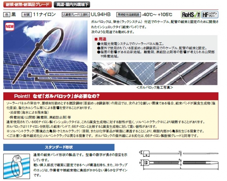 ガルバロックは、架台(ラックシステム)付近でのケーブル、配管の結束と固定のために開発されたインシュロックタイ(結束バンドです)。