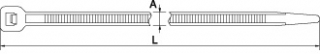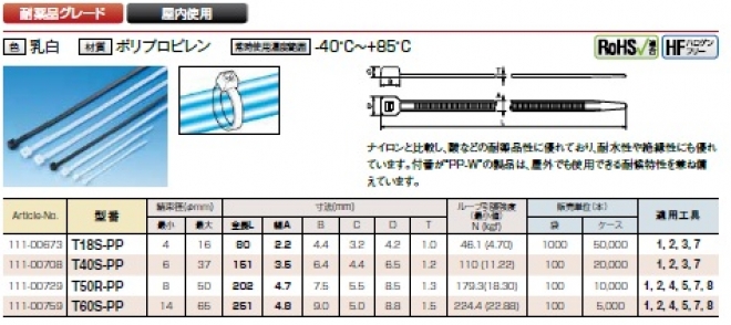 | 型番 | 結束径最小(mm) | 結束径最大(mm) | 全長L(mm) | 幅A(mm) | B(mm) | C(mm) | D(mm) | T(mm) | ループ引張強度(最小値)N(kgf) | 販売単位・袋(本) | 販売単位・ケース(本) | 適用工具 |