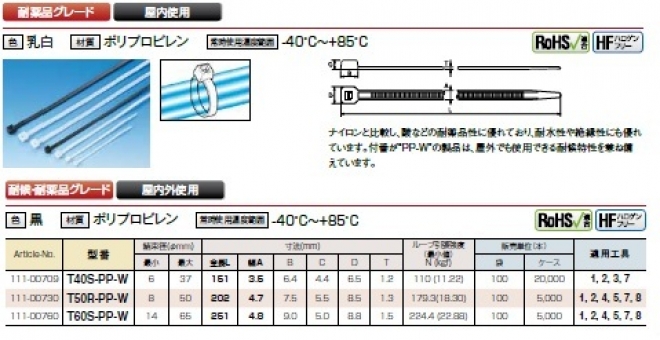 | 型番 | 結束径最小(mm) | 結束径最大(mm) | 全長L(mm) | 幅A(mm) | B(mm) | C(mm) | D(mm) | T(mm) | ループ引張強度(最小値)N(kgf) | 販売単位・袋(本) | 販売単位・ケース(本) | 適用工具 |