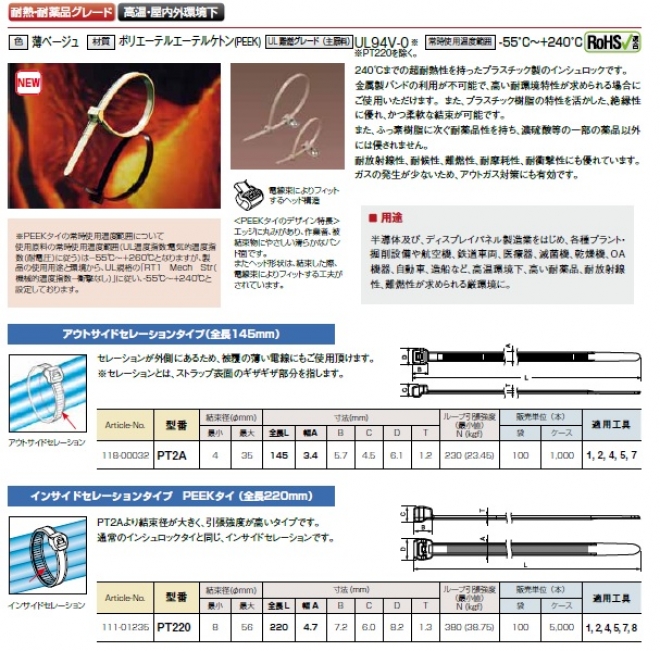 用途・・・半導体及び、ディスプレイパネル製造業をはじめ、各種プラント・掘削設備や航空機、鉄道車両、医療器、滅菌機、乾燥機、OA機器、自動車、造船など、高温環境下、高い耐薬品性、耐放射線性、難燃性が求められる厳環境に。