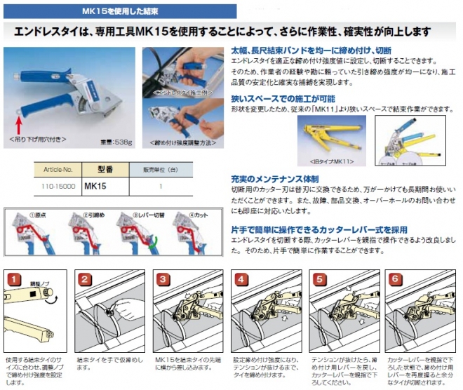 エンドレスタイは、専用工具MK15を使用することによって、さらに作業性、確実性が向上します。