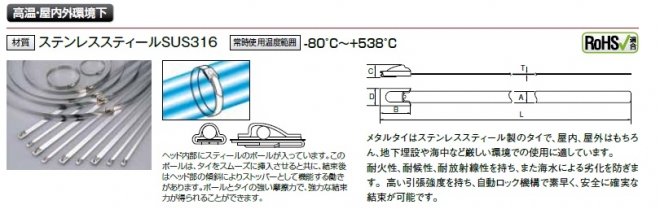 メタルタイはステンレススティール製のタイで、屋内、屋外はもちろん、地下埋設や海中など厳しい環境での使用に適しています。耐火性、耐候性、耐放射線性を持ち、また海水による劣化を防ぎます。