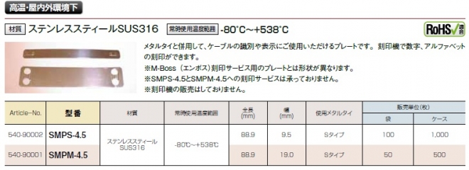 | 型番 | 材質 | 常時使用温度範囲 | 全長(mm) | 幅(mm) | 使用メタルタイ | 販売単位・袋(枚) | 販売単位・ケース(枚) |