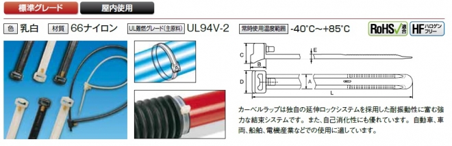 | 型番 | 結束径最大(mm) | 全長L(mm) | 幅A(mm) | B(mm) | C(mm) | D(mm) | E(mm) | ループ引張強度(最小値)N(kgf) | 販売単位・袋(本) | 販売単位・ケース(本) |