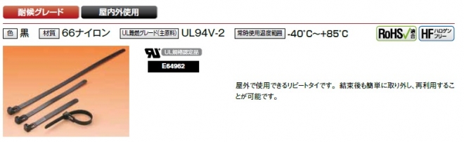 屋外で使用できるリピートタイです。結束後も簡単に取り外し、再利用することが可能です。材質:66ナイロン