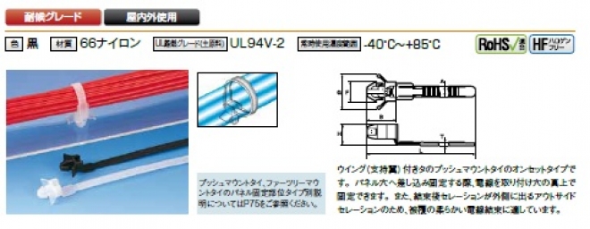 結束したハーネスが取り付け穴の真上で固定されるため、位置決めが容易ウィング(支持翼)付のプッシュマウントタイのオンセットタイプです。