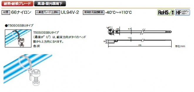 | 型番 | 色 | 使用ビス | 結束径最小(mm) | 結束径最大(mm) | 全長(mm) | 幅(mm) | ループ引張強度(最小値)N(kgf) | 販売単位・袋(本) | 販売単位・ケース(本) | 適用工具 |