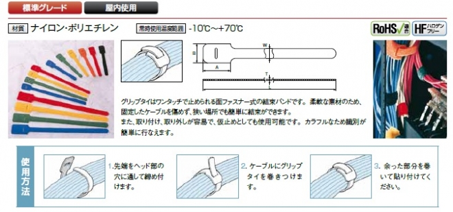 再使用可能タイプ面ファスナー式のため、ケーブルを傷めず、狭い場所でも簡単に結束可能