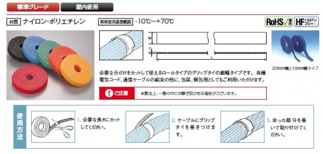 タイプも様々で、定尺タイプ(長さ148㎜~371㎜)や、ロールタイプ(幅10㎜、20㎜ 長さ5m)、難燃性・静電気低減タイプ(幅21.3㎜ 長さ10m)など、用途に合わせてお選びいただけます。
