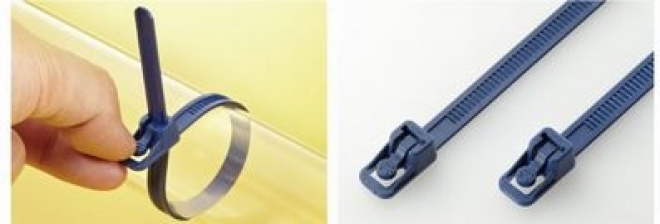 ●食品製造ラインで異物混入リスクを回避する結束バンドとして、多数のご採用を頂いている、メタルコンテントタイの再結束タイプを発売開始しました。