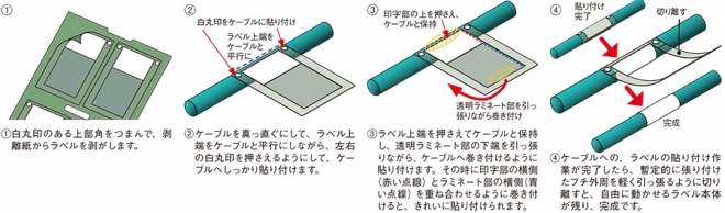 ●ラベルをLANケーブルに巻き付け(貼り付け)後に、ラベルを回転させたり、前後へスライドさせることができ、接続後のLANケーブルでも、ラベル表記を簡単に確認できます。※