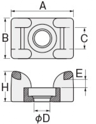 | 型番 | A(㎜) | B(㎜) | φD (㎜) | C(㎜) | E(㎜) | H(㎜) | 使用インシュロックタイ | 適用ビス | 販売単位 (個) |