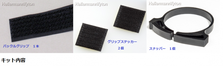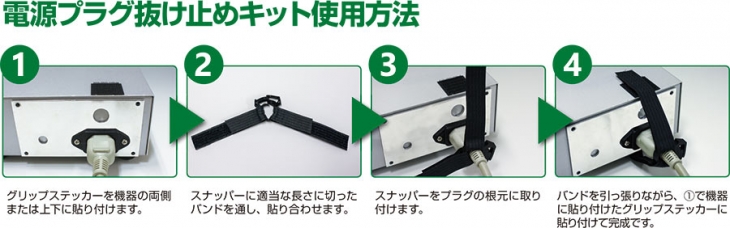 機器の大きさを選ばない、後付け可能な電源プラグ抜け止め対策キット●グリップステッカー(GT-ST)、スナッパー(SNP-10-OW)、バックルグリップ(BGR-B-W16)を使用した、電源プラグ抜け止め用キットです。